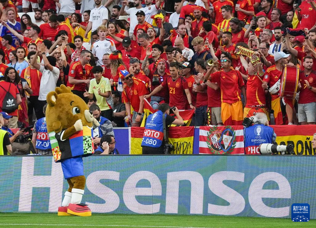 7月9日,欧锦赛吉祥物阿尔巴熊与西班牙队球迷互动。新华社记者 张帆 摄