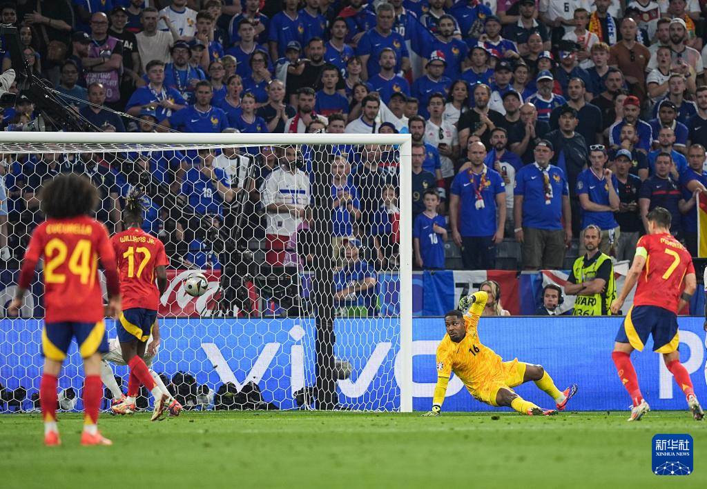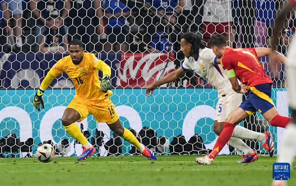 7月9日,法国队守门员迈尼昂(右二)未能扑救出西班牙队球员奥尔莫的射门。新华社记者 张帆 摄