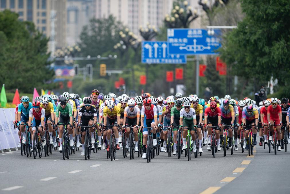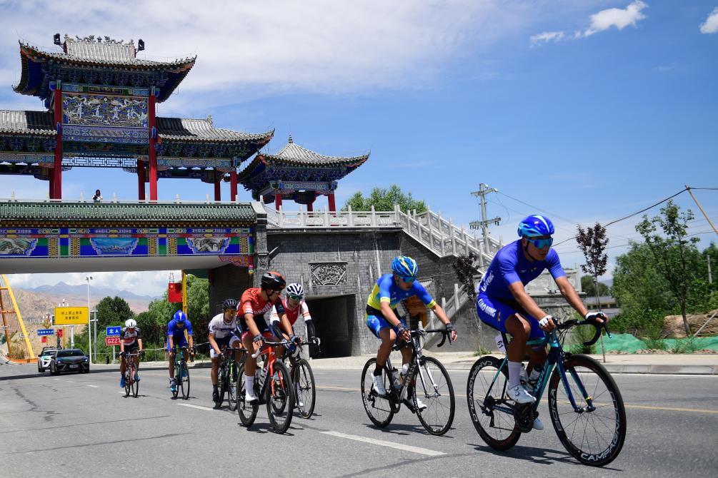 2023年7月9日,第22届环青海湖国际公路自行车赛结束第一赛段西宁绕圈赛的角逐。新华社记者 张龙 摄