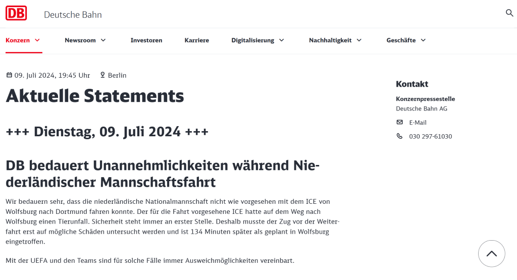 公告称:“我们非常抱歉,荷兰队无法按计划乘坐城际特快列车从沃尔夫斯堡前往多特蒙德。原定列车在前序路程途中发生碰撞动物的事故。安全永远是第一位的。列车在继续使用前,我们必须检查可能出现的损坏情况。列车因此比计划晚134分钟抵达沃尔夫斯堡。”