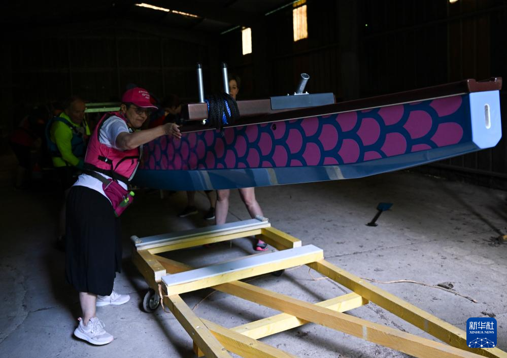 这是7月7日,“冠军龙女”龙舟队队员准备从仓库中运出龙舟。新华社记者 贺长山 摄