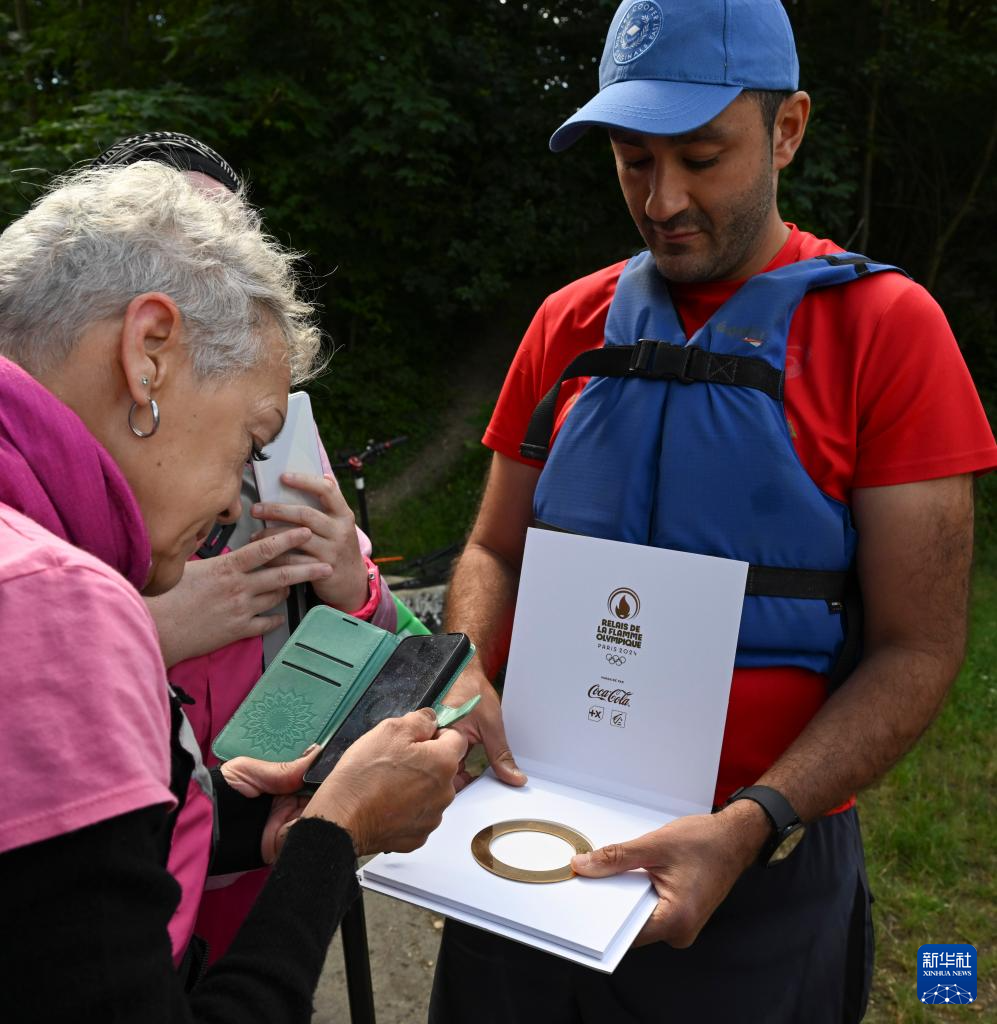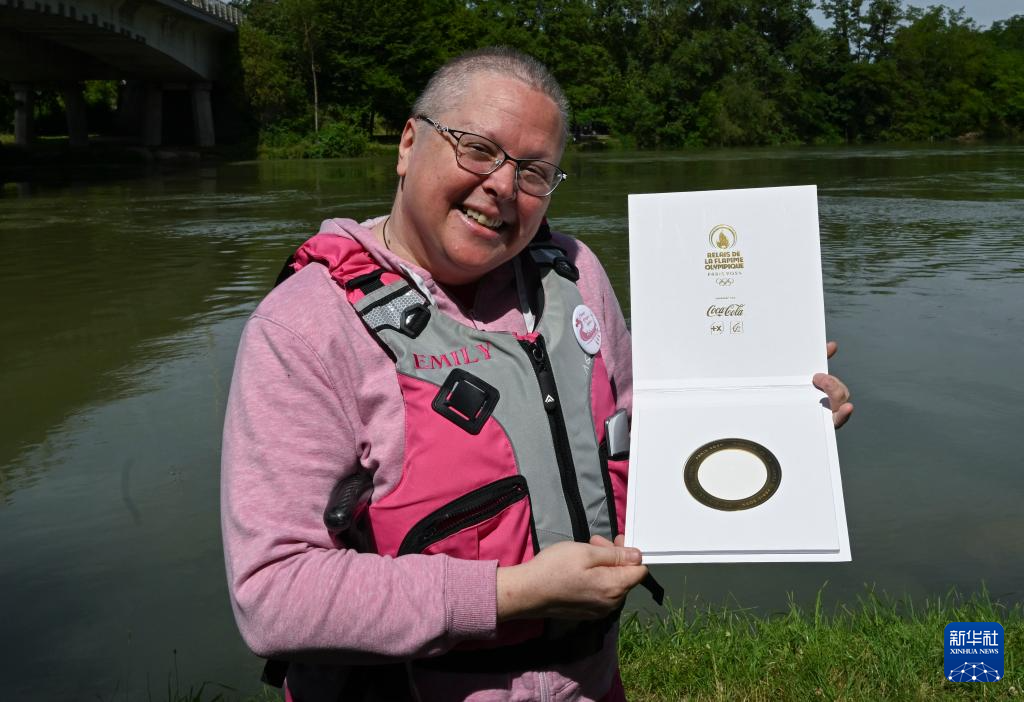 这是7月7日,艾米莉与巴黎奥运会圣火传递纪念品合影。新华社记者 贺长山 摄