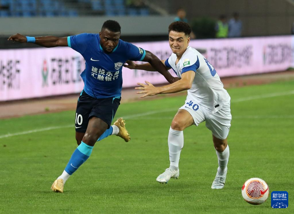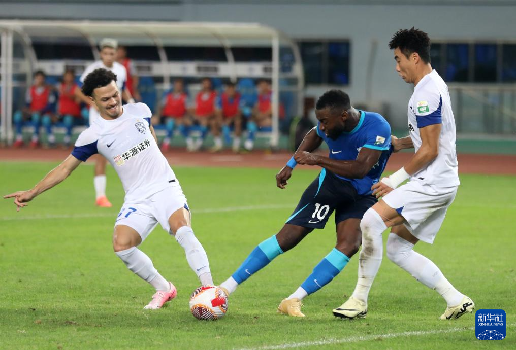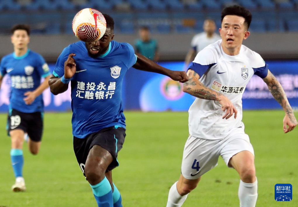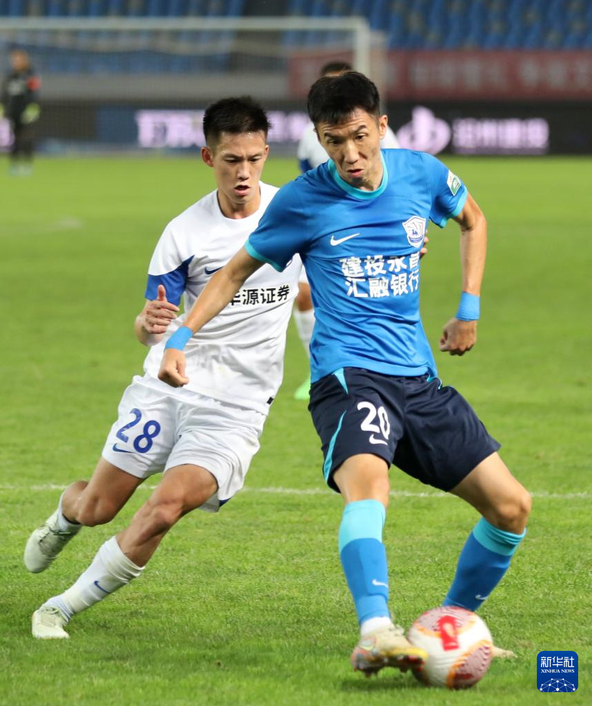 7月12日,沧州雄狮队球员刘鑫瑜(右)在比赛中和武汉三镇队球员王毅拼抢。新华社发(周洋摄)