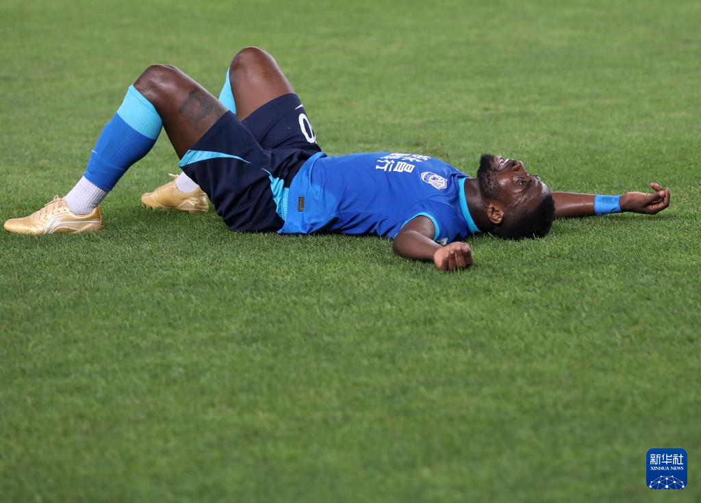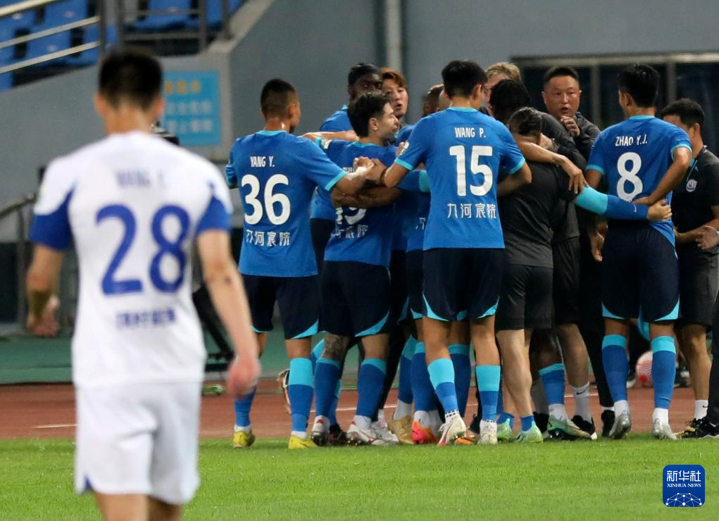 7月12日,沧州雄狮队球员在比赛中庆祝进球。新华社发(周洋摄)