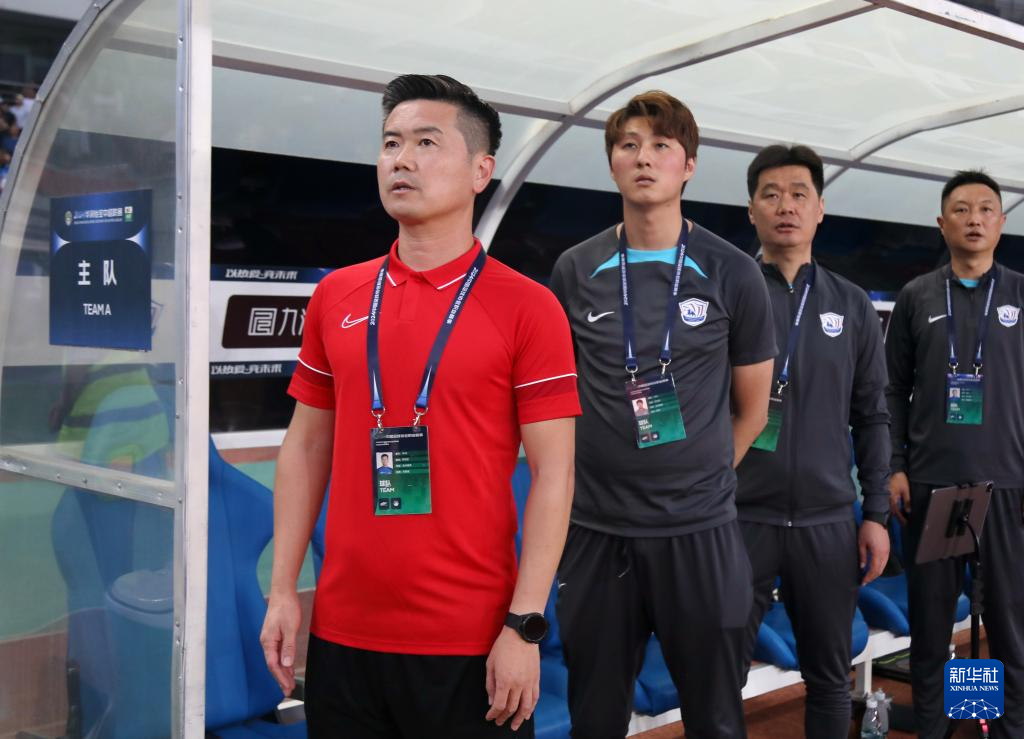 7月12日,沧州雄狮队主教练肇俊哲(左一)在比赛前。新华社发(周洋摄)