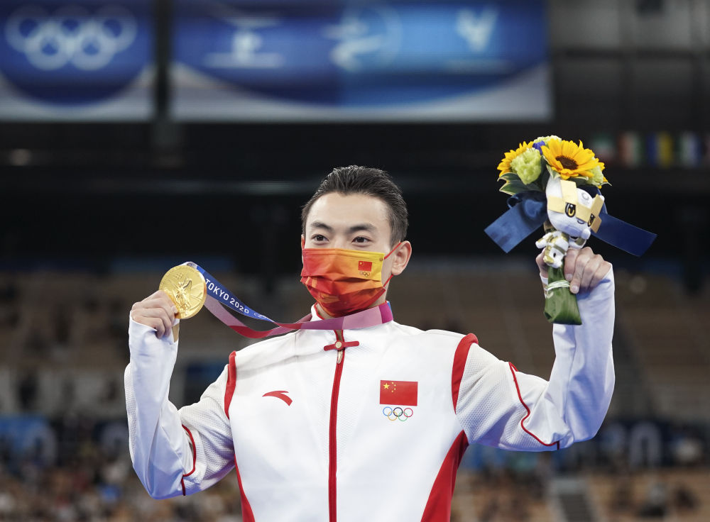 2021年8月3日,中国选手邹敬园在颁奖仪式上。当日,在东京奥运会体操男子双杠决赛中,邹敬园夺得冠军。新华社记者 程敏 摄