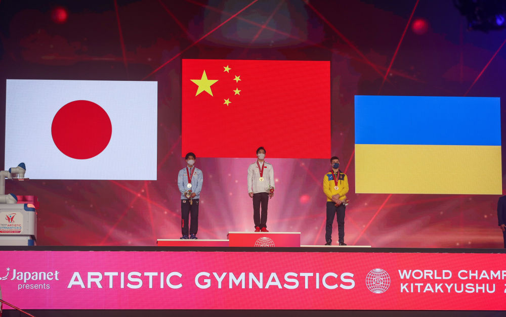 2021年10月22日,冠军中国选手张博恒(中)和亚军日本选手桥本大辉(左)、季军乌克兰选手科夫通在体操世锦赛男子个人全能颁奖仪式上。新华社记者 杜潇逸 摄