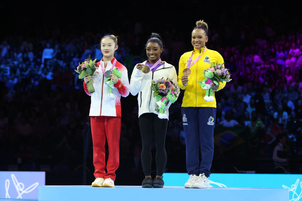 2023年10月8日,冠军美国选手拜尔斯(中)、亚军中国选手周雅琴(左)和季军巴西选手安德拉德在安特卫普体操世锦赛平衡木颁奖仪式上。新华社记者 赵丁喆 摄
