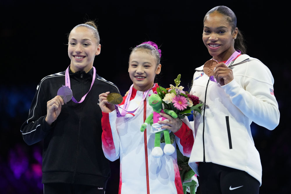 2023年10月7日,冠军中国选手邱祺缘(中)、亚军阿尔及利亚选手内穆尔(左)、季军美国选手琼斯在颁奖仪式上。当日,在比利时安特卫普举行的2023年体操世界锦标赛女子高低杠比赛中,邱祺缘以15.100分的成绩夺得冠军。新华社记者 郑焕松 摄