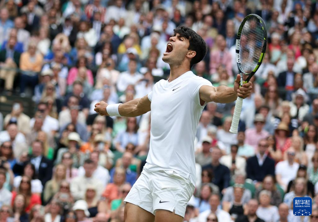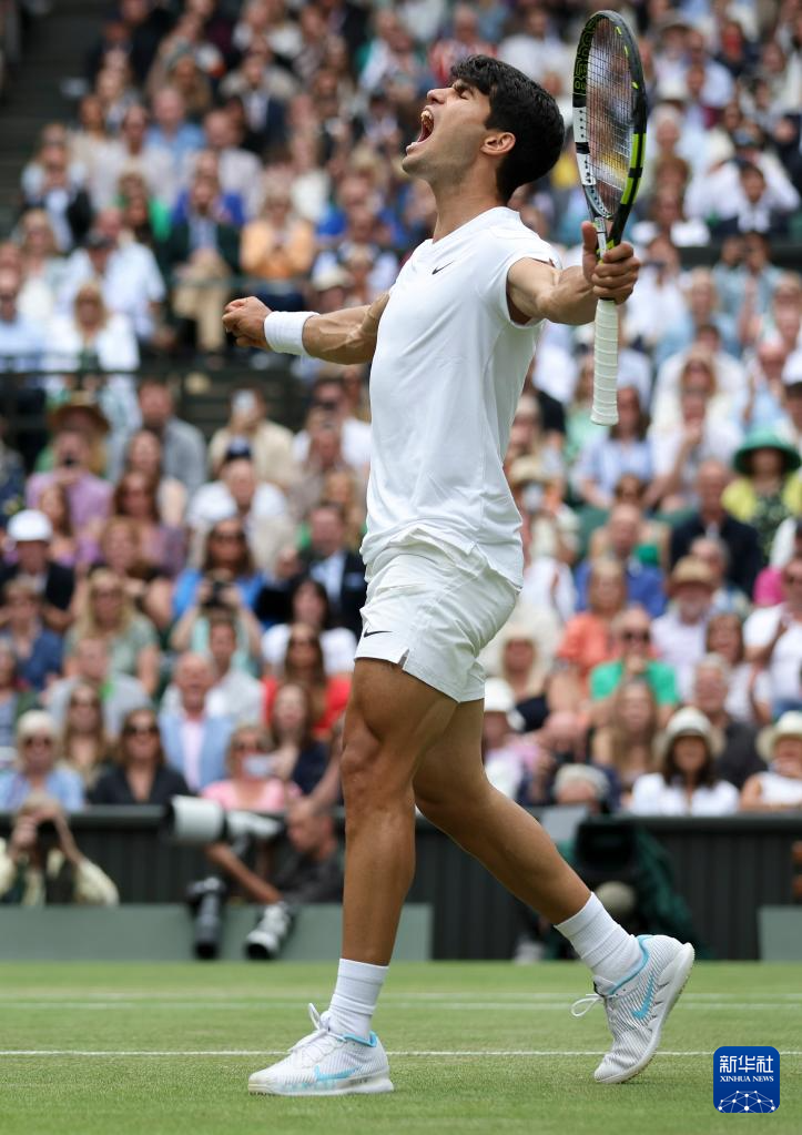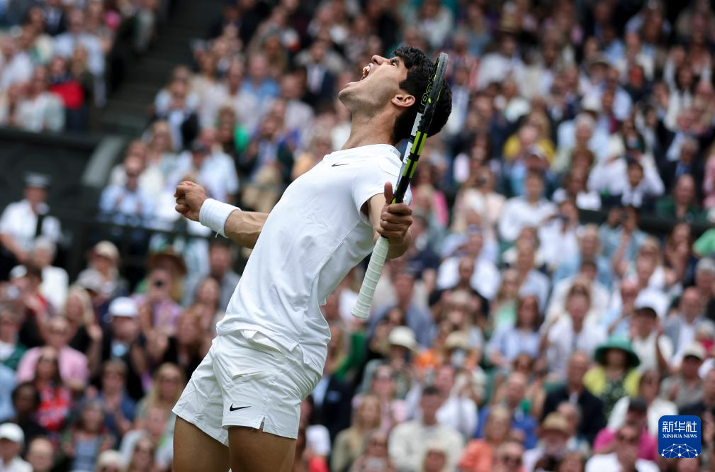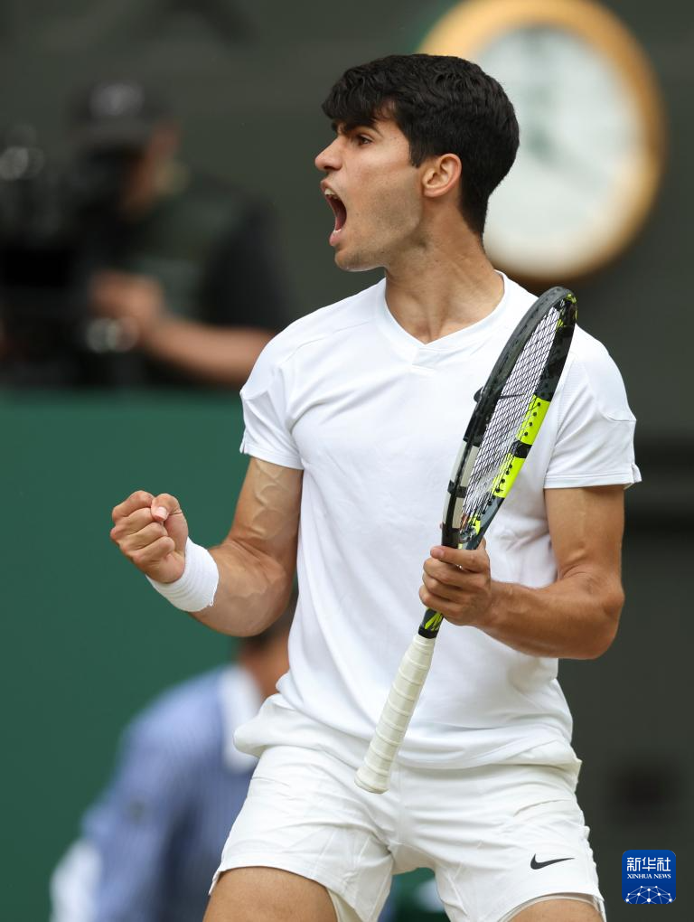 7月12日,阿尔卡拉斯在获胜后振臂庆祝。新华社记者 韩岩 摄
