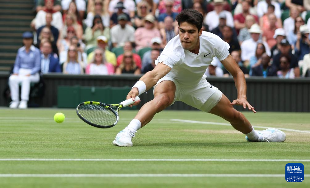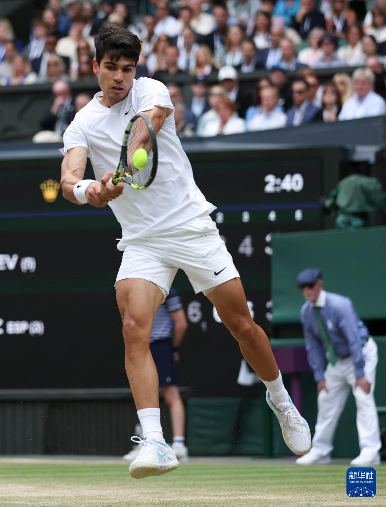 7月12日,阿尔卡拉斯在比赛中回球。新华社记者 韩岩 摄