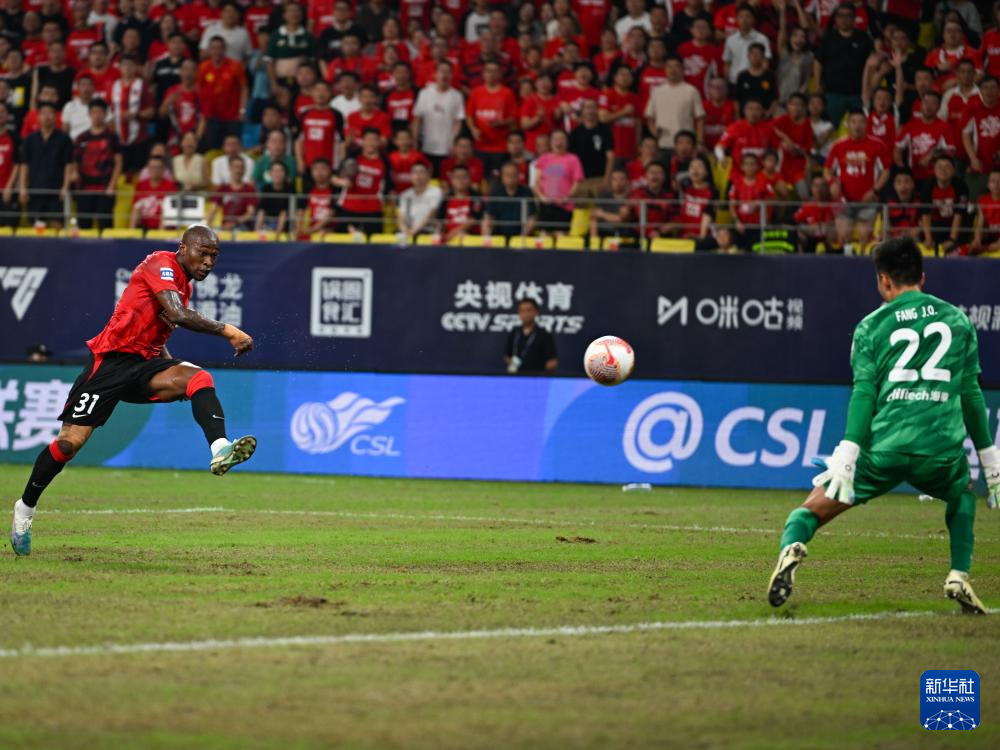 7月12日,成都蓉城队球员帕拉西奥斯(左)在比赛中射门。新华社记者 王曦 摄