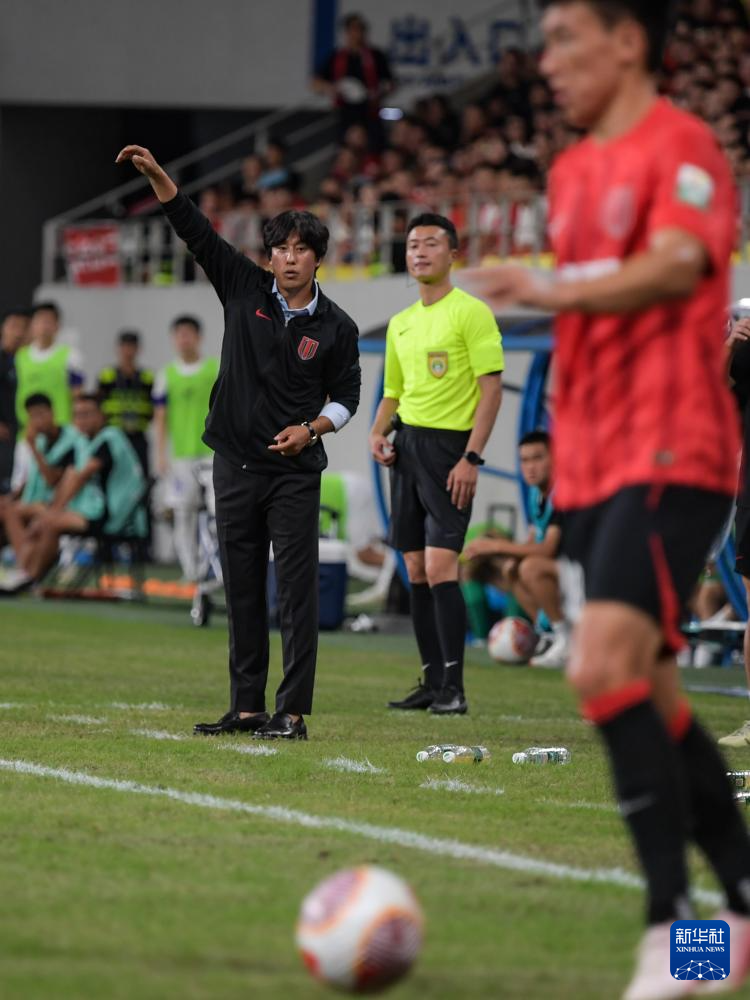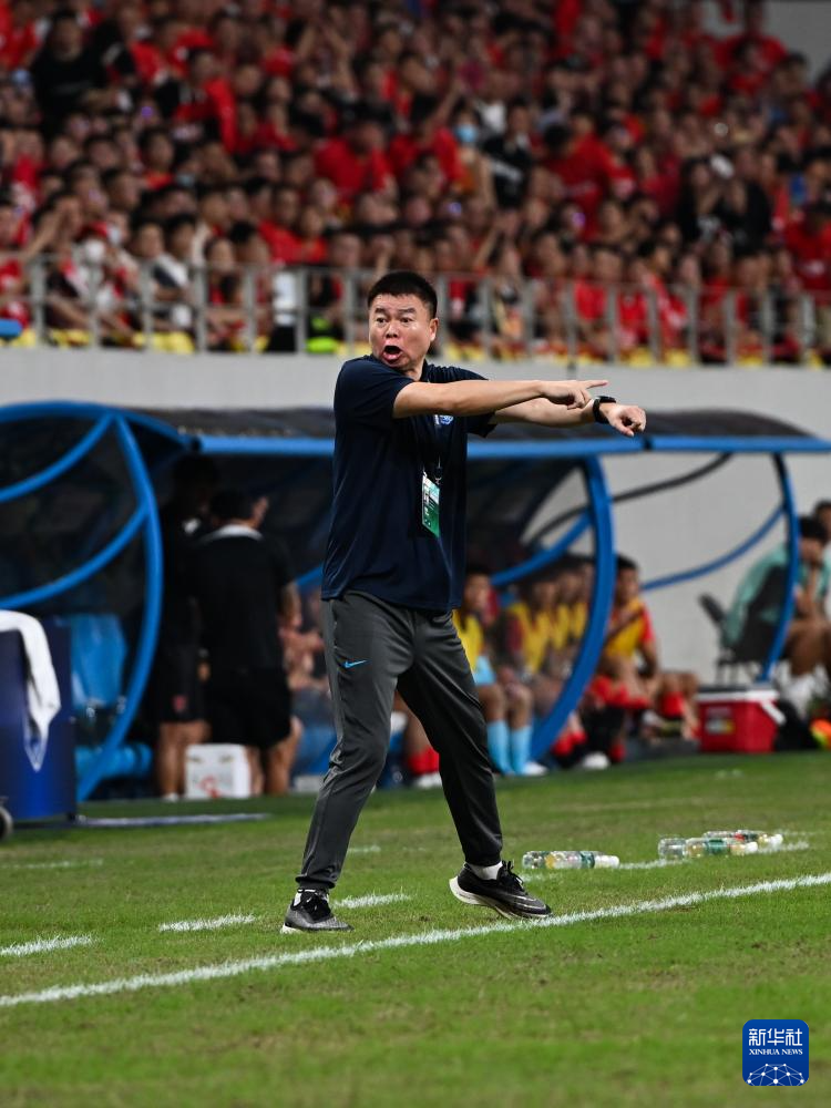 7月12日,成都蓉城队主教练徐正源(后左)在场边指挥。新华社记者 王曦 摄