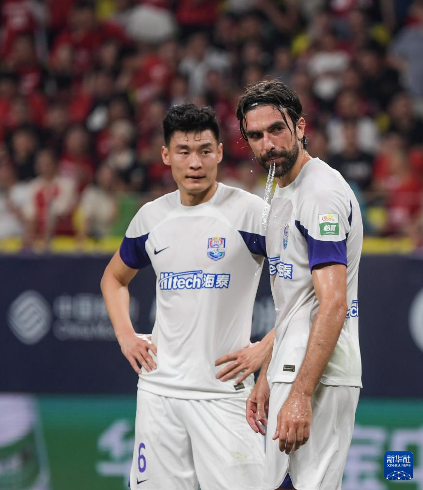 7月12日,天津津门虎队球员孔帕尼奥(右)在比赛中补水。新华社记者 王曦 摄
