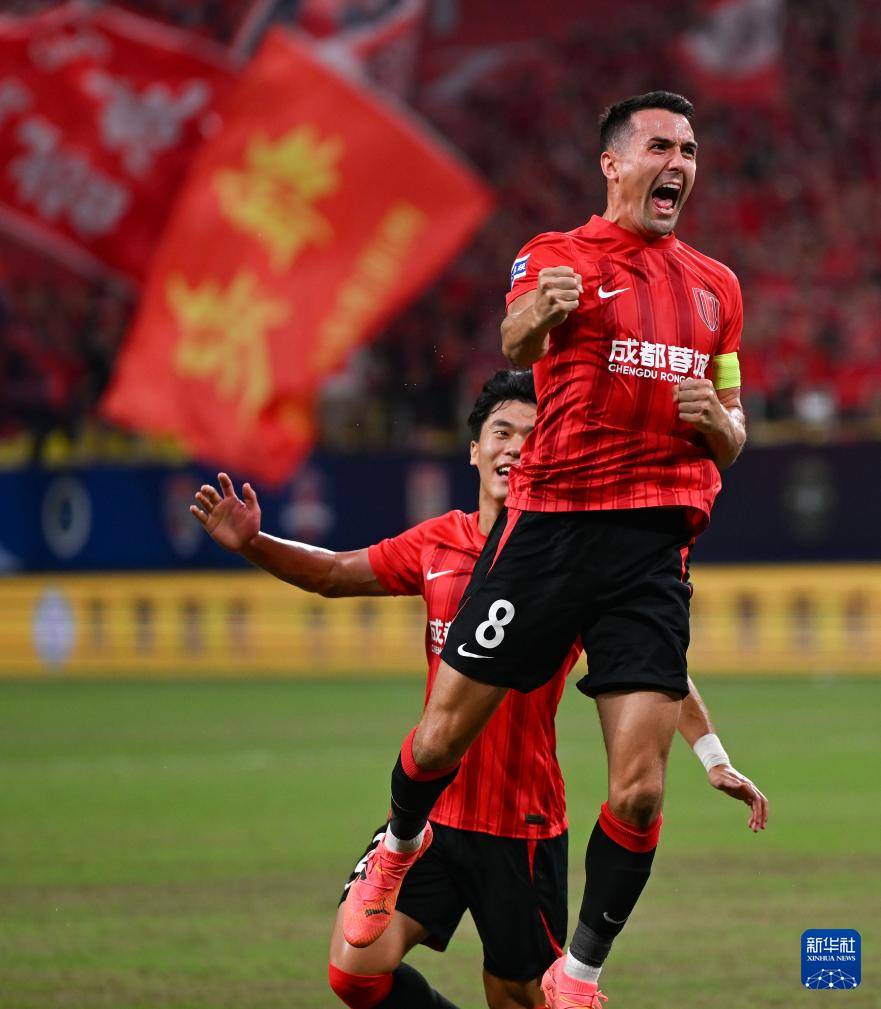 7月12日,成都蓉城队球员在比赛中庆祝进球。新华社记者 王曦 摄