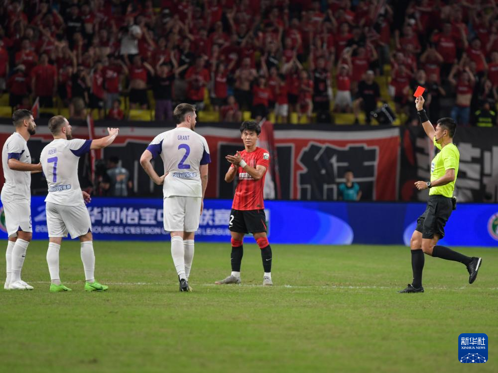 7月12日,主裁判马宁(右一)在观看VAR(视频助理裁判)后向天津津门虎队球员哈达斯(左一)出示红牌。新华社记者 王曦 摄