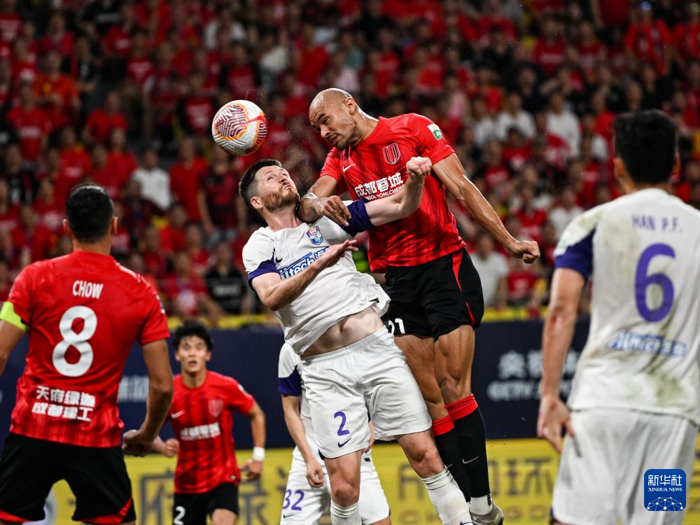 7月12日,成都蓉城队球员费利佩(上右)和天津津门虎队球员格兰特(上左)在比赛中争顶。新华社记者 王曦 摄