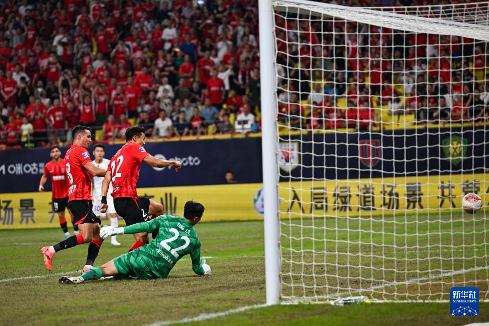 7月12日,成都蓉城队球员周定洋(前中)在比赛中射门得分。新华社记者 王曦 摄