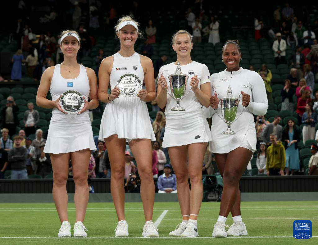 7月13日,冠军组合西尼亚科娃(右二)/汤森德(右一)与亚军组合达布罗斯基(左一)/鲁特利夫在颁奖仪式上。新华社记者 韩岩 摄