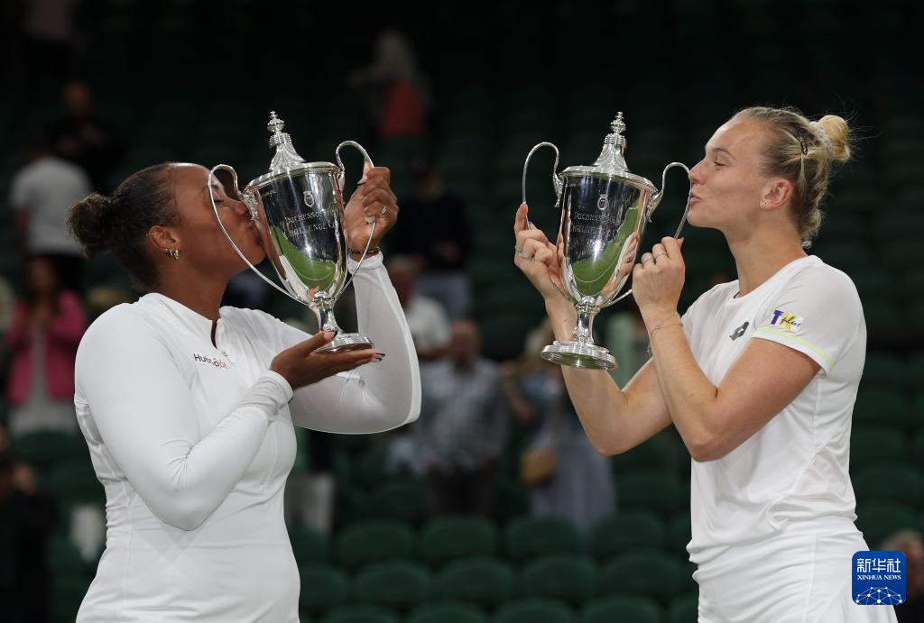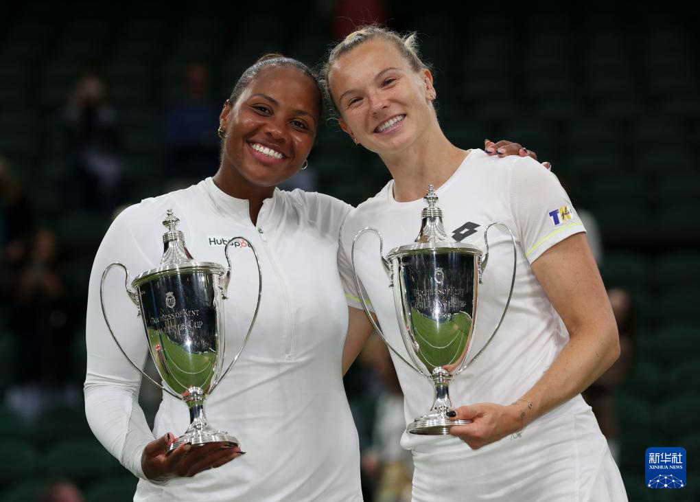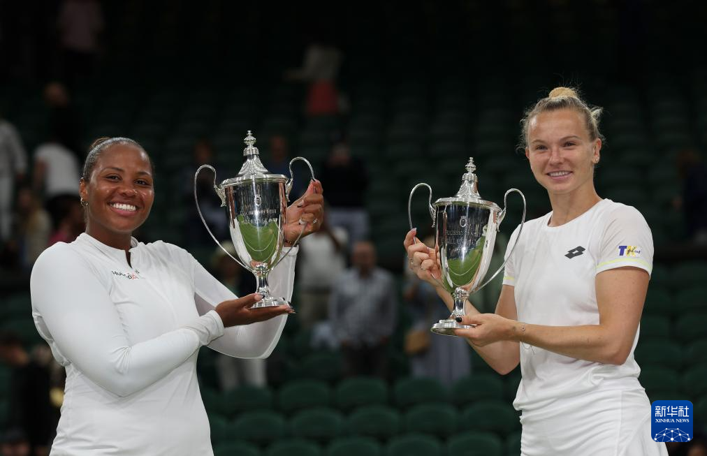 7月13日,西尼亚科娃/汤森德(左)在颁奖仪式上手捧奖杯庆祝。新华社记者 韩岩 摄