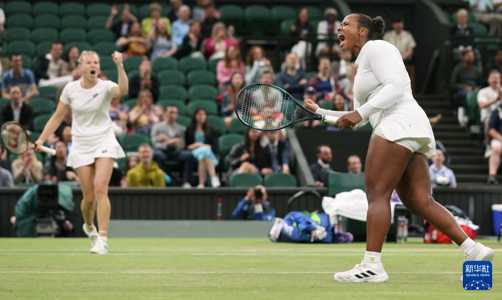 7月13日,西尼亚科娃(右)/汤森德在获胜后庆祝。新华社记者 韩岩 摄