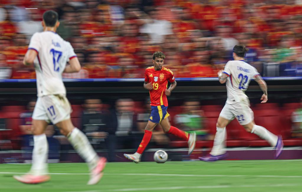 7月9日,西班牙队球员亚马尔(中)在比赛中进攻。当日,在德国慕尼黑进行的2024年欧洲足球锦标赛半决赛中,西班牙队2比1战胜法国队,晋级决赛。 新华社记者 白雪飞 摄