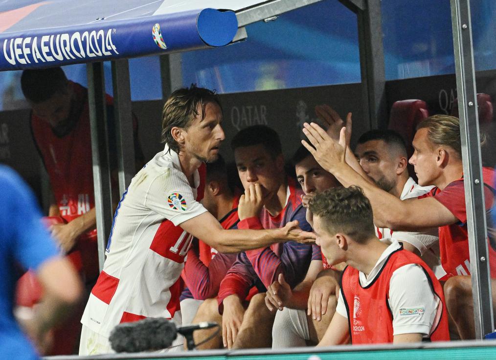 6月24日,克罗地亚队球员莫德里奇(左一)在比赛中被替换下场。当日,在德国莱比锡举行的2024年欧洲足球锦标赛B组第三轮比赛中,克罗地亚队1比1战平意大利队。 新华社记者 任鹏飞 摄