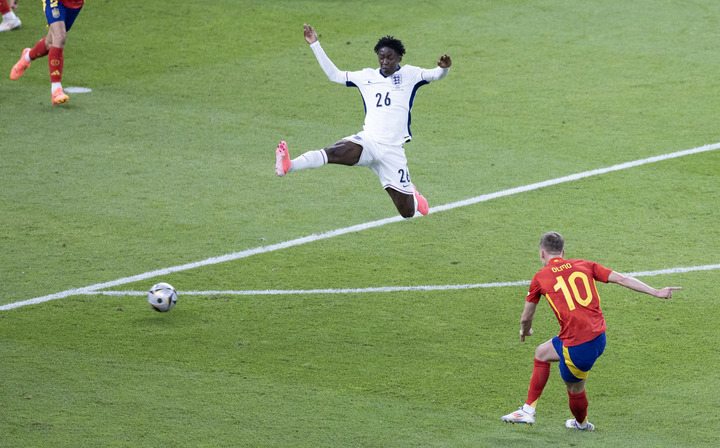 7月14日,英格兰队球员科比·梅努封堵西班牙队球员丹尼尔·奥尔莫的射门。当日,在德国柏林进行的2024年欧洲足球锦标赛决赛中,西班牙队2比1战胜英格兰队,夺得冠军。新华社记者 白雪飞摄