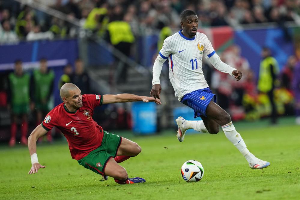 7月5日,法国队球员登贝莱(右)带球突破葡萄牙队球员佩佩。当日,在德国斯图加特进行的2024年欧洲足球锦标赛四分之一决赛中,法国队经过点球大战以5比3战胜葡萄牙队,晋级四强。新华社记者 潘昱龙 摄