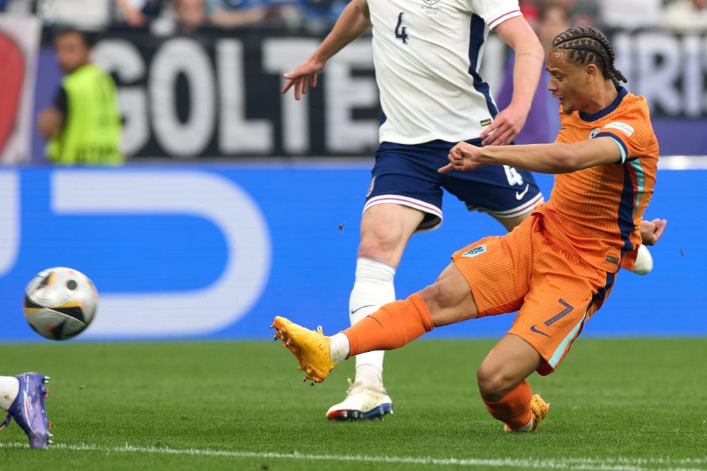 7月10日,荷兰队球员哈维·西蒙斯在比赛中射门得分。当日,在德国多特蒙德进行的2024年欧洲足球锦标赛半决赛中,英格兰队2比1战胜荷兰队,晋级决赛。新华社记者 孟鼎博 摄