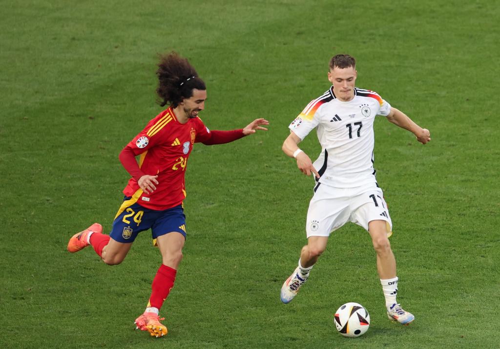7月5日,西班牙队球员库库雷利亚(左)与德国队球员维尔茨在比赛中拼抢。 当日,在德国斯图加特进行的2024年欧洲足球锦标赛四分之一决赛中,西班牙队2比1战胜德国队,晋级四强。新华社记者 张帆 摄