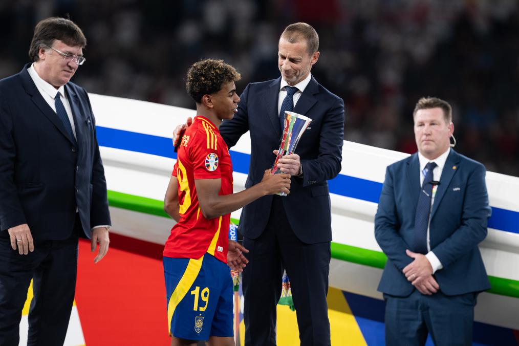 7月14日,西班牙队球员亚马尔(左二)获颁本届欧锦赛最佳年轻球员奖。 新华社记者 肖艺九 摄