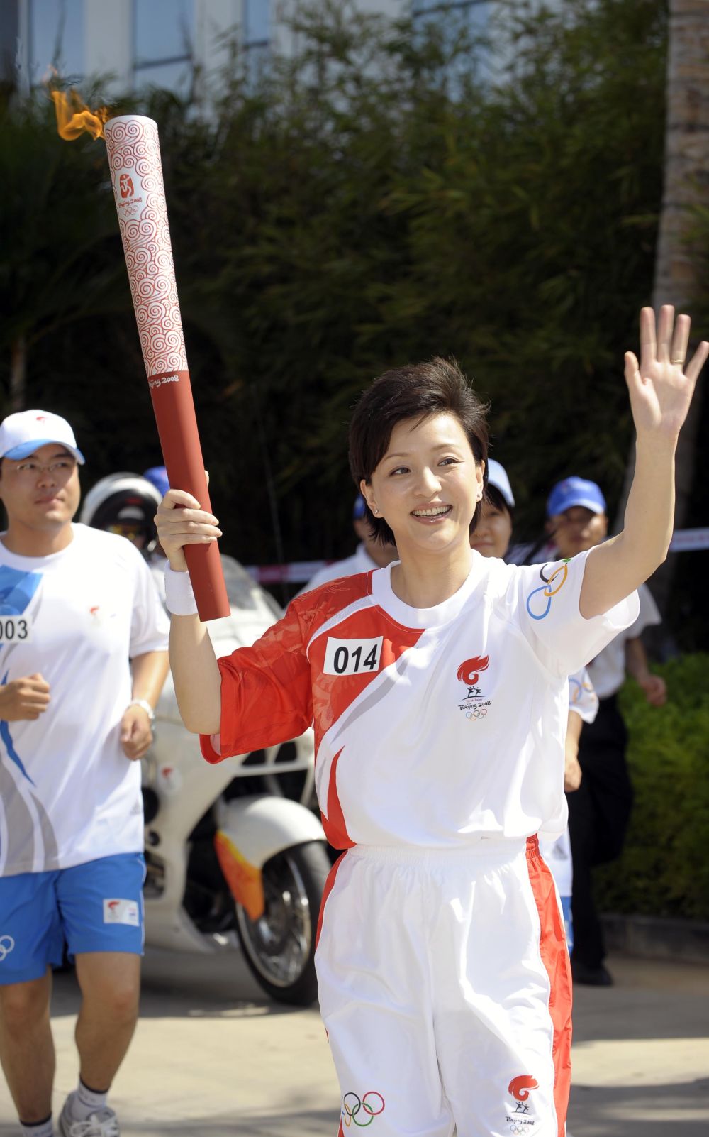 2008年5月4日,火炬手杨澜在进行传递。当日,北京奥运会圣火传递活动在海南三亚举行。 新华社记者 戚恒 摄