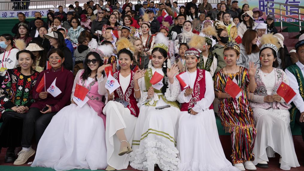 ↑新疆代表团运动员参加表演项目竞技类“姑娘追”比赛