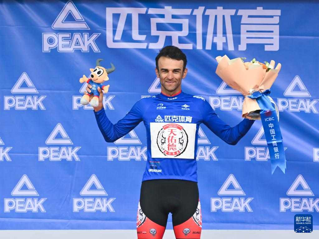 7月14日,青海天佑德车队车手萨义德·萨法尔扎德身着代表亚洲最佳的蓝衫在颁奖仪式上庆祝。新华社记者 张龙 摄
