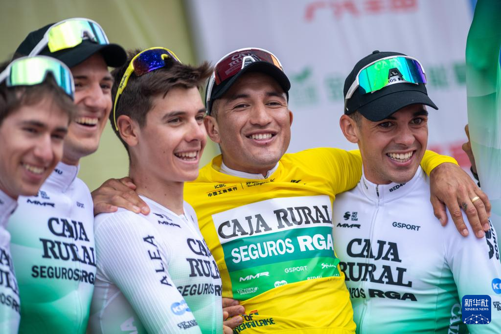7月14日,西班牙农业银行车队车手赫费尔松·阿尔维罗·塞佩达(右二)身着代表总成绩第一的黄衫在领奖台上与队友庆祝。新华社发(潘彬彬摄)