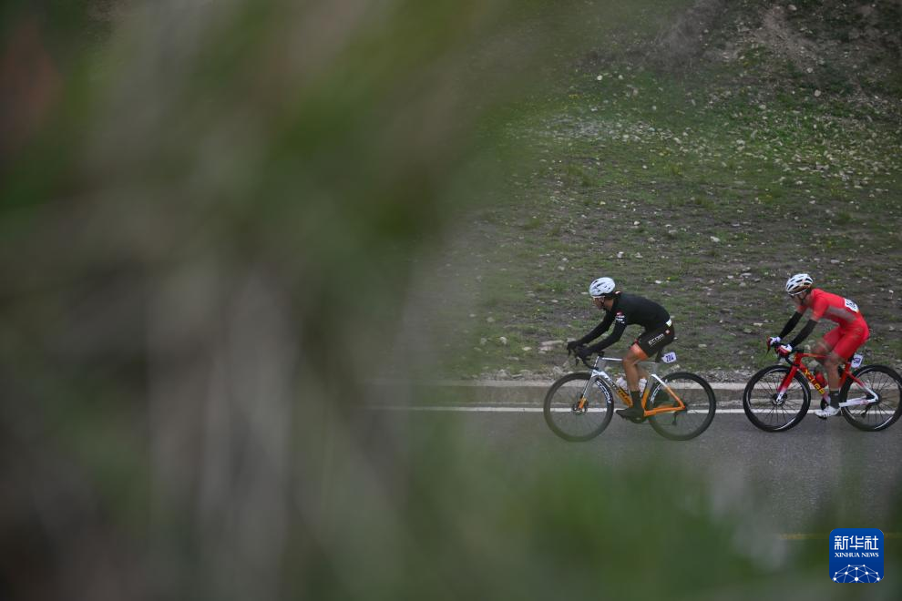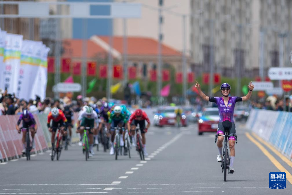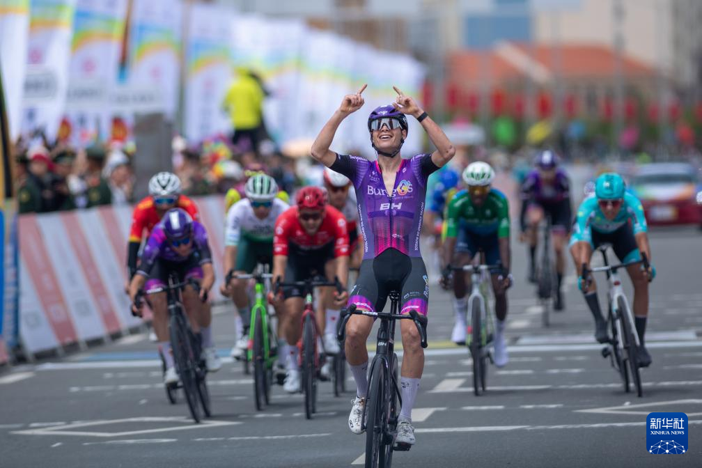 7月14日,西班牙布尔戈斯BH车队车手埃里克·法贡德斯(前)在冲过终点线后庆祝。新华社发(潘彬彬摄)