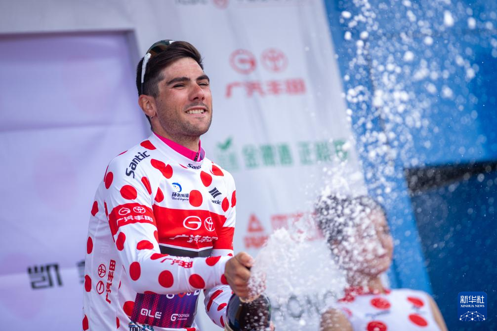 7月14日,西班牙布尔戈斯BH车队车手马里奥·阿帕里西奥身着代表爬坡总积分第一名的圆点衫在领奖台上喷洒香槟。新华社发(潘彬彬摄)