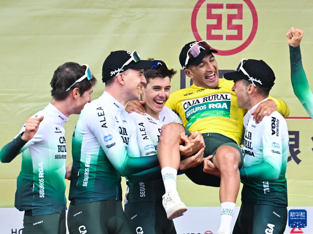7月14日,西班牙农业银行车队车手赫费尔松·阿尔维罗·塞佩达(右)赛后与队友一起庆祝。新华社记者 张龙 摄