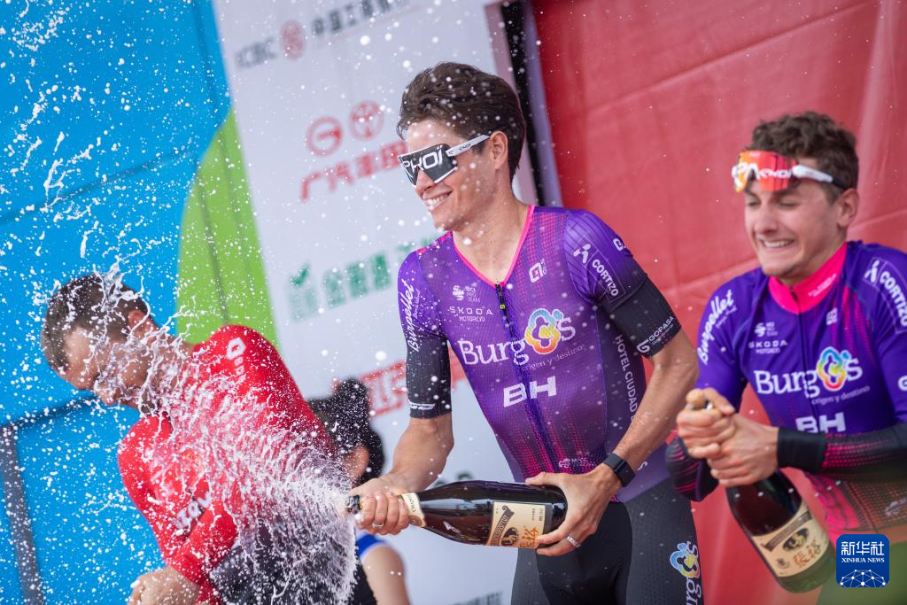 7月14日,赛段第一名西班牙布尔戈斯BH车队车手埃里克·法贡德斯(中)在领奖台上喷洒香槟。新华社发(潘彬彬摄)