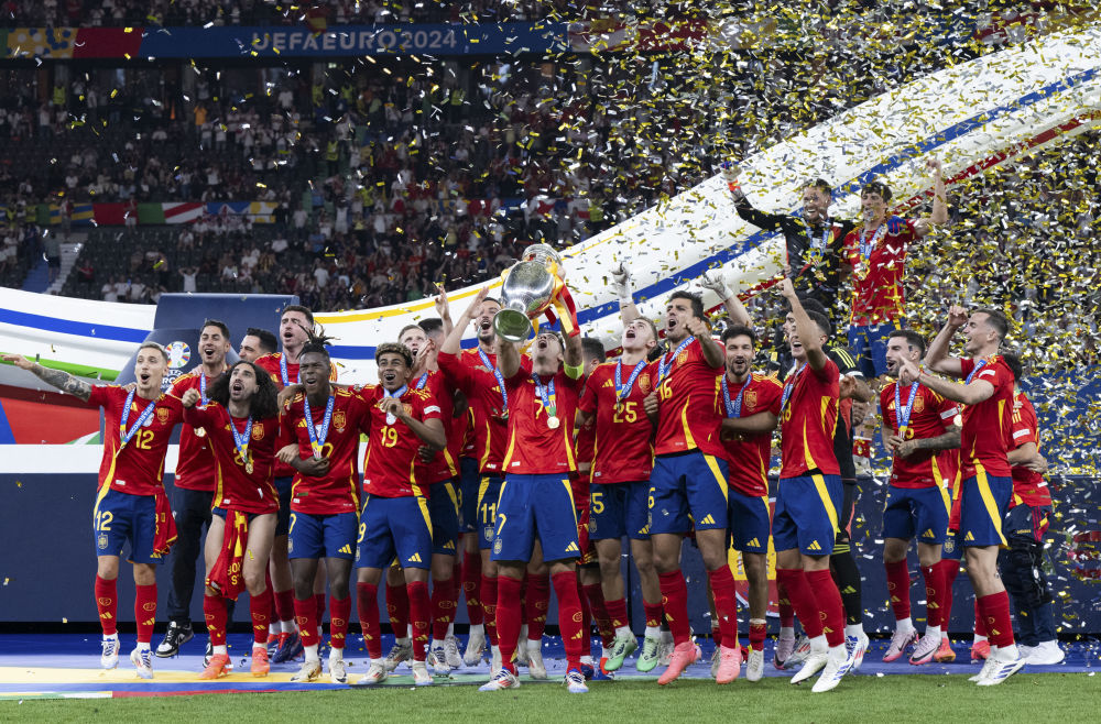 7月14日,西班牙队在颁奖仪式上庆祝。当日,在德国柏林进行的2024年欧洲足球锦标赛决赛中,西班牙队2比1战胜英格兰队,第四次夺得欧锦赛冠军。新华社记者 肖艺九 摄