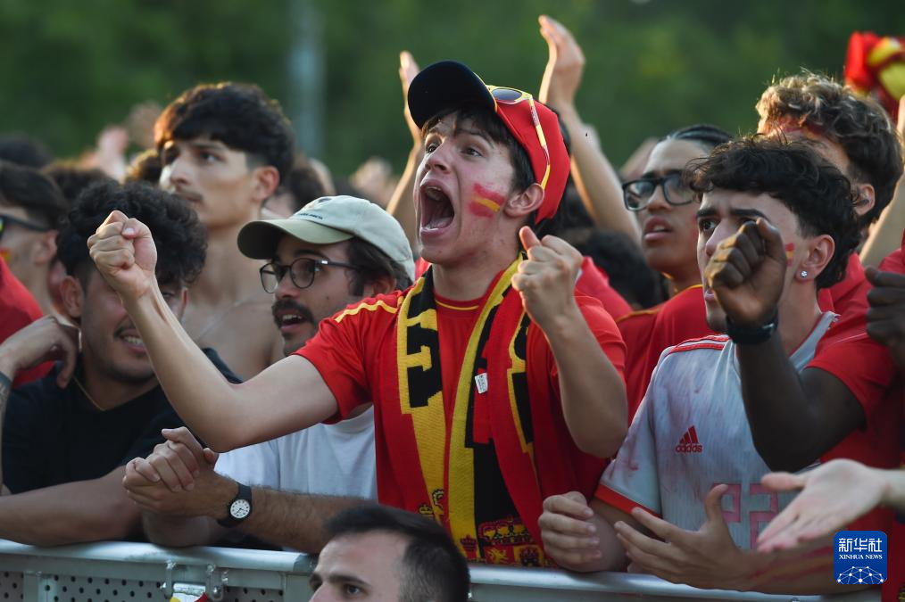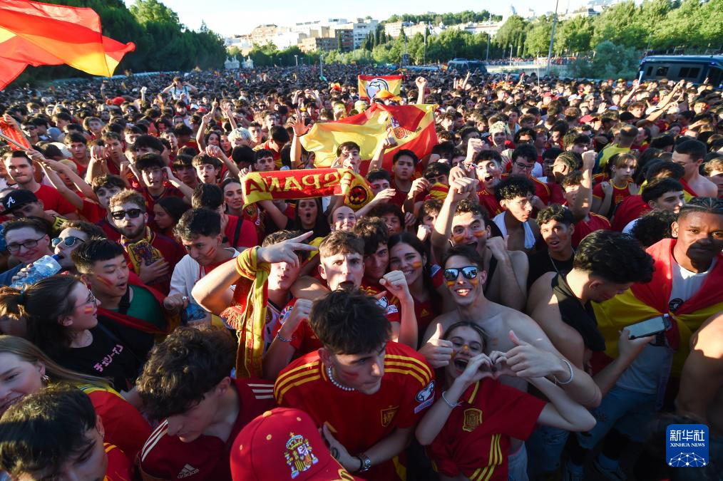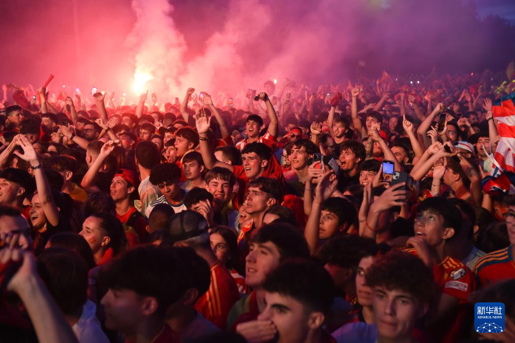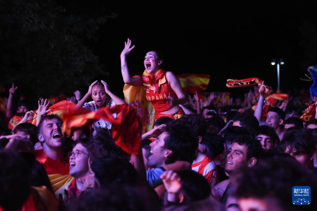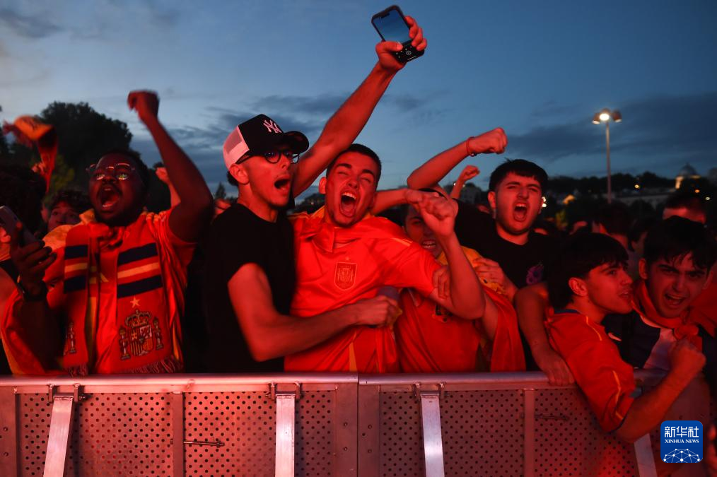 当日,西班牙队球迷在马德里护城河公园通过大屏幕观看2024欧洲足球锦标赛决赛西班牙对英格兰的比赛,庆祝球队夺冠。
