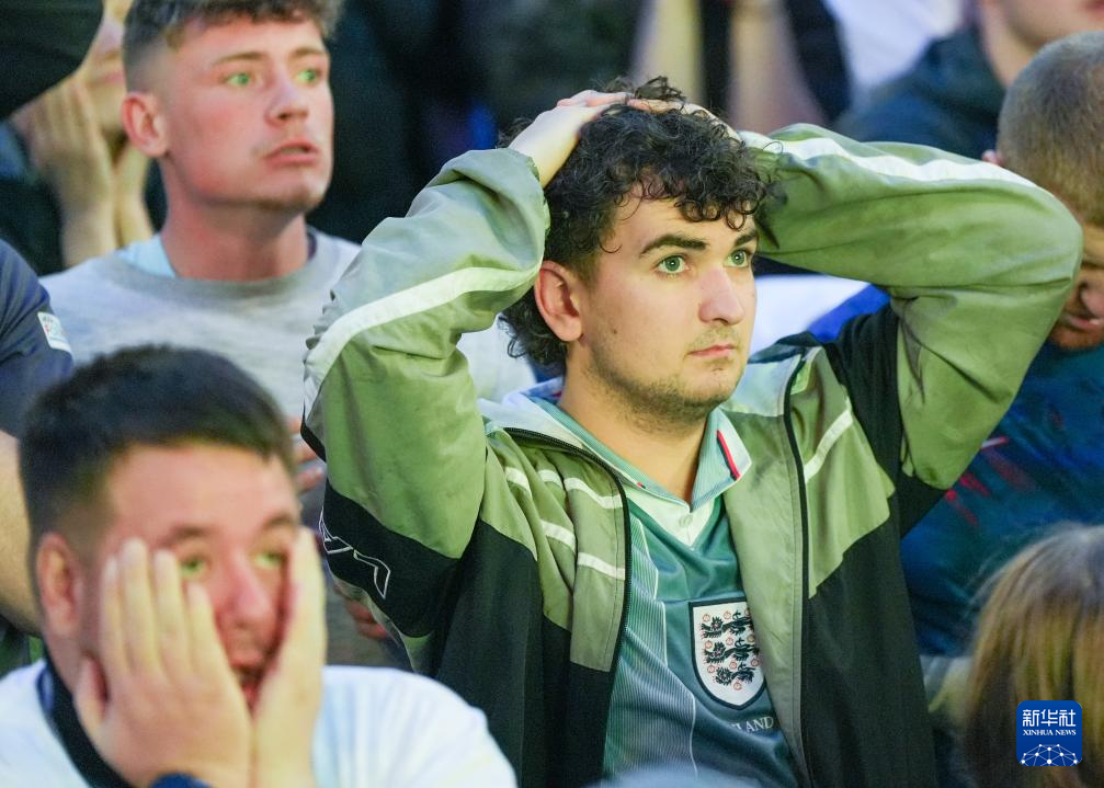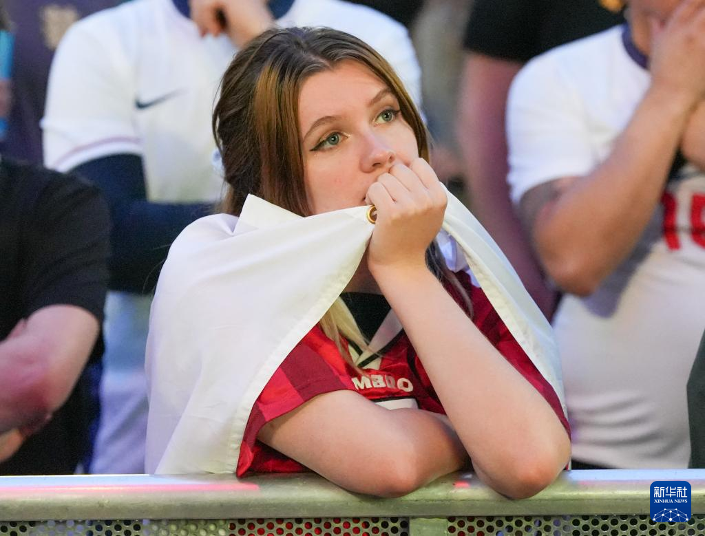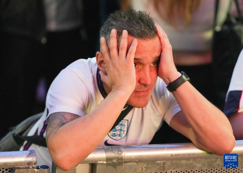 7月14日,在英国利兹的英格兰队球迷观看比赛直播时表情失落。新华社发