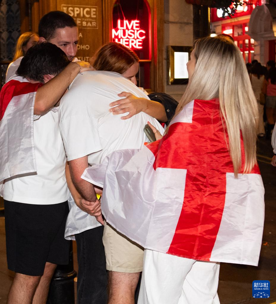 7月14日,在英国利兹的英格兰队球迷观看比赛直播后互相拥抱安慰。新华社发
