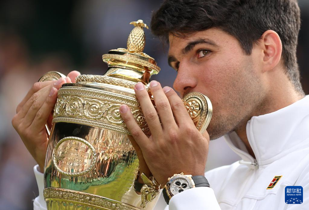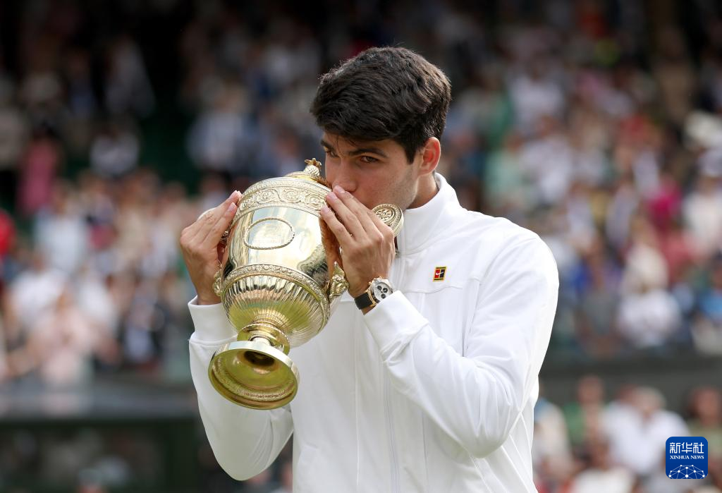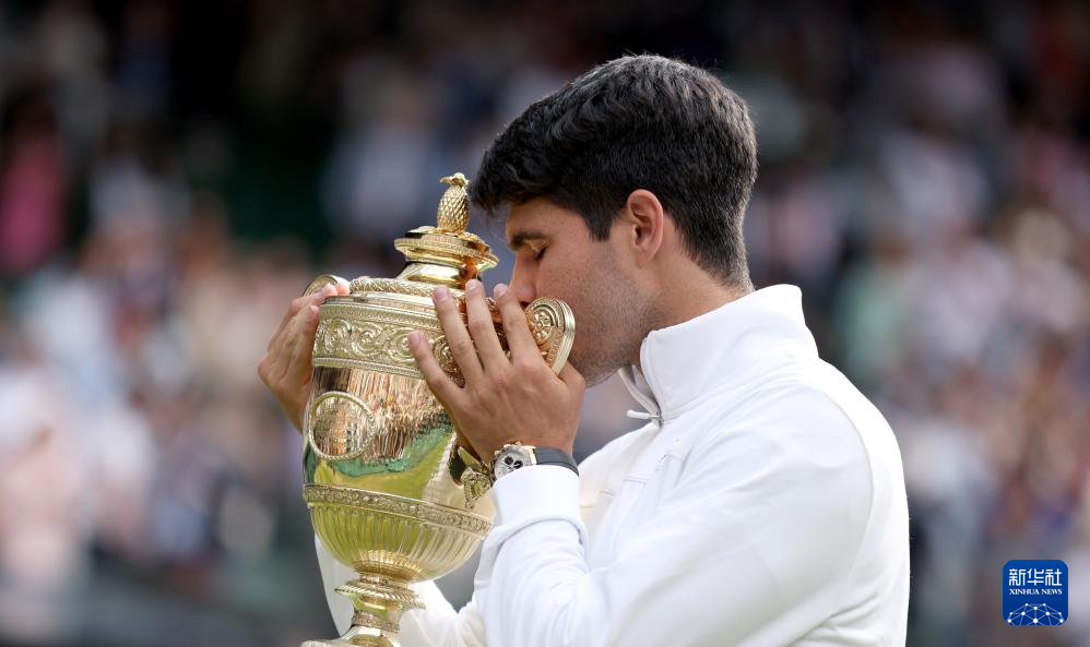 7月14日,阿尔卡拉斯亲吻奖杯。新华社记者 李颖 摄