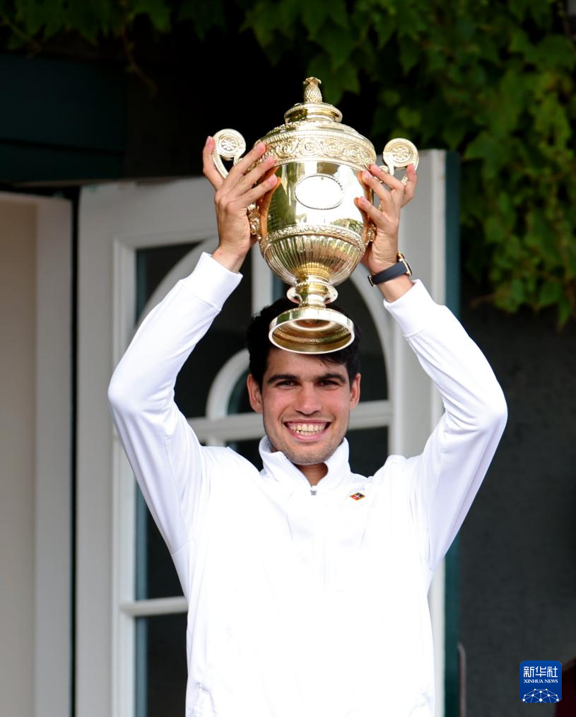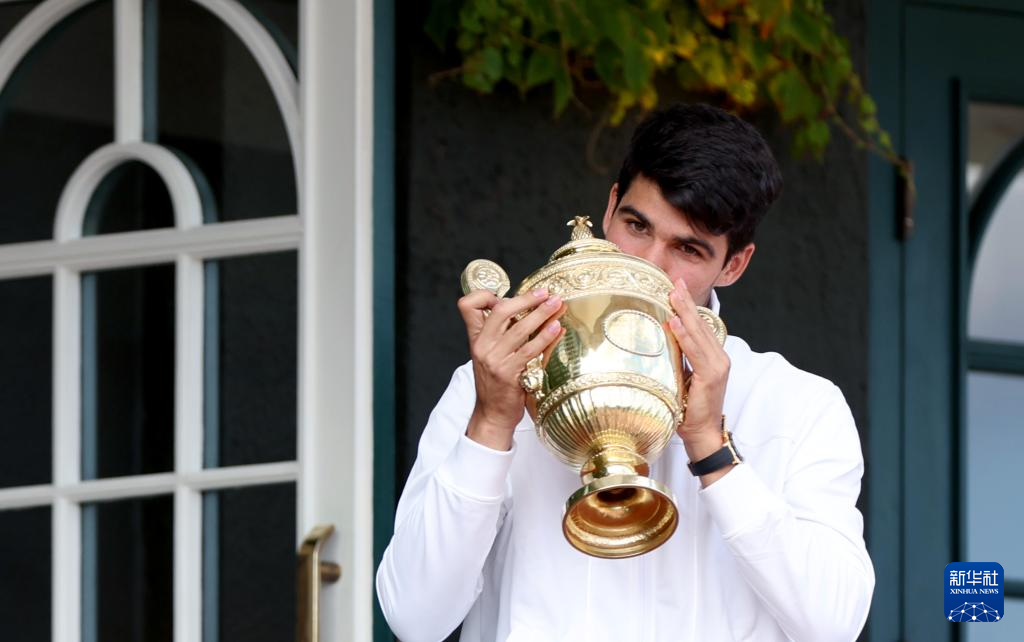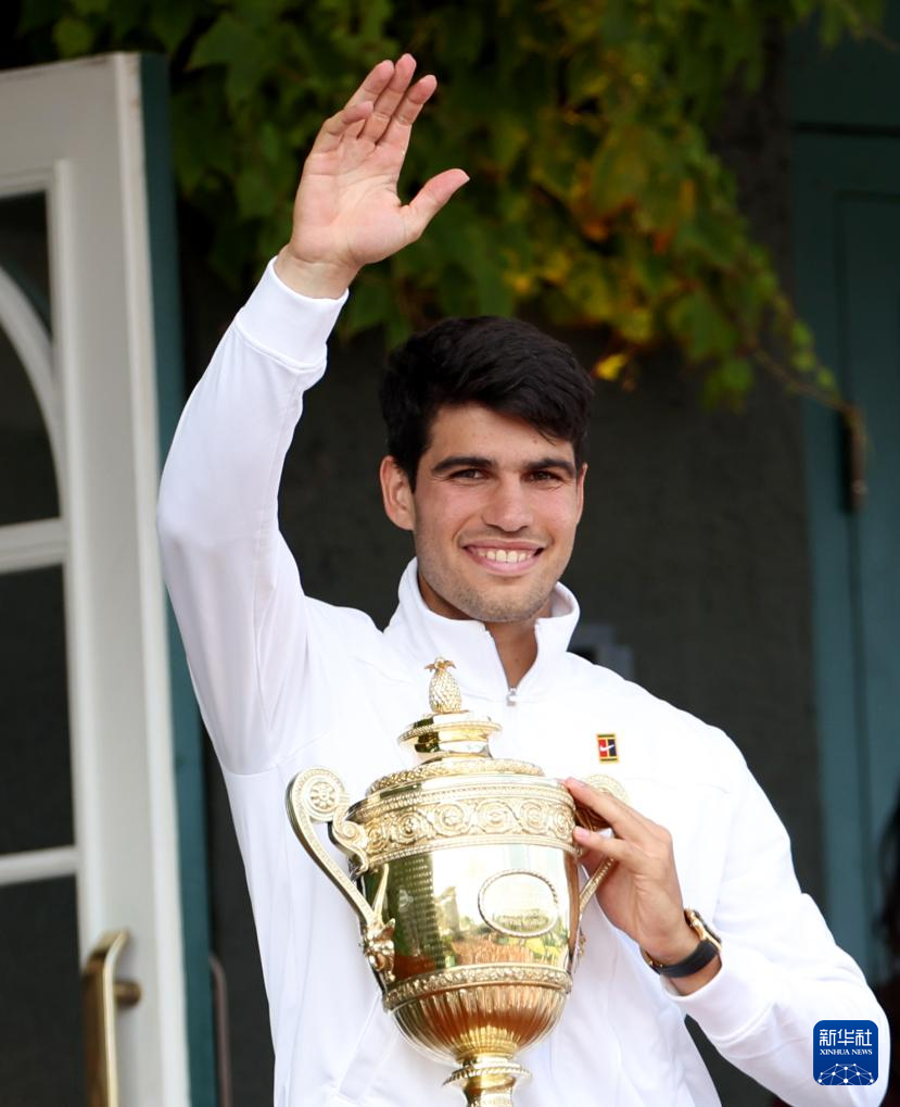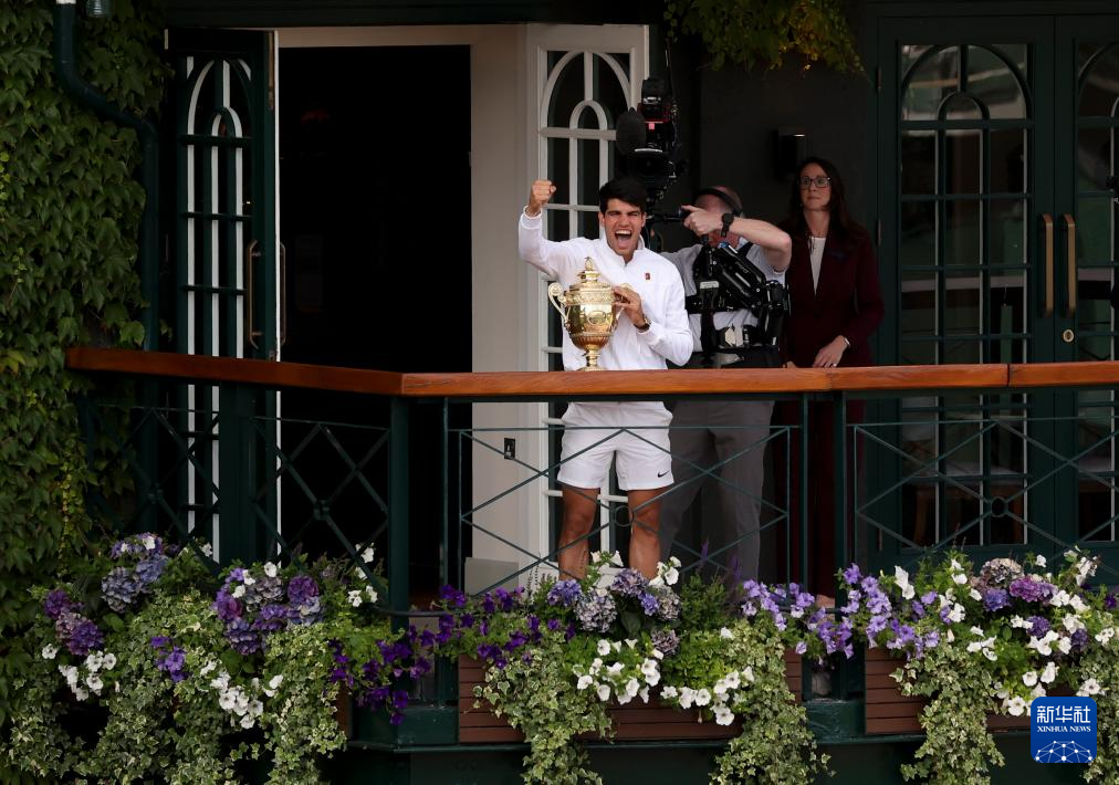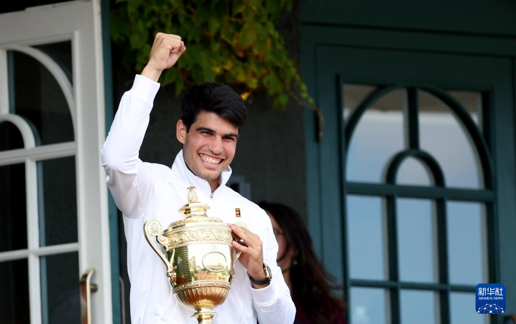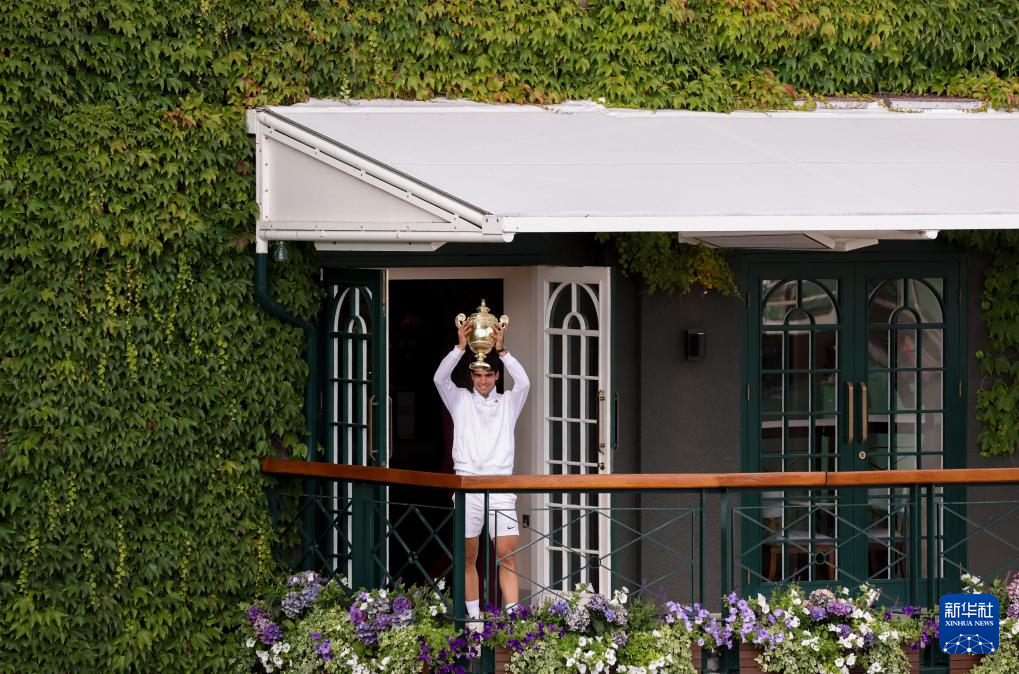 7月14日,阿尔卡拉斯在俱乐部阳台上展示奖杯。新华社记者 韩岩 摄