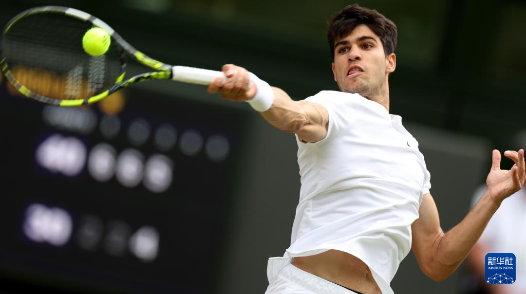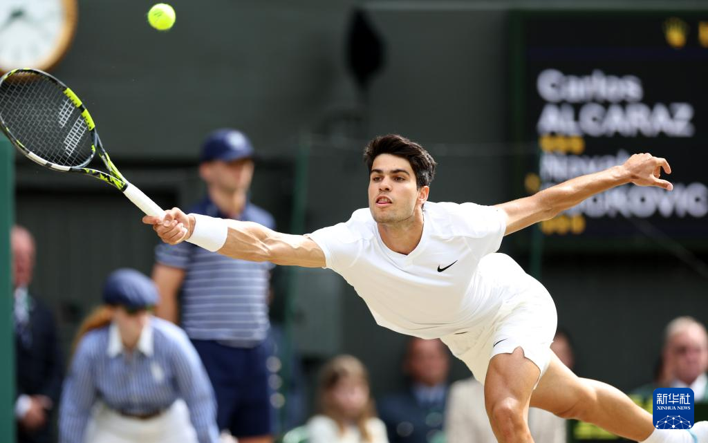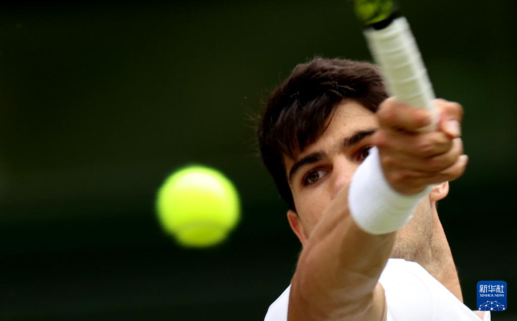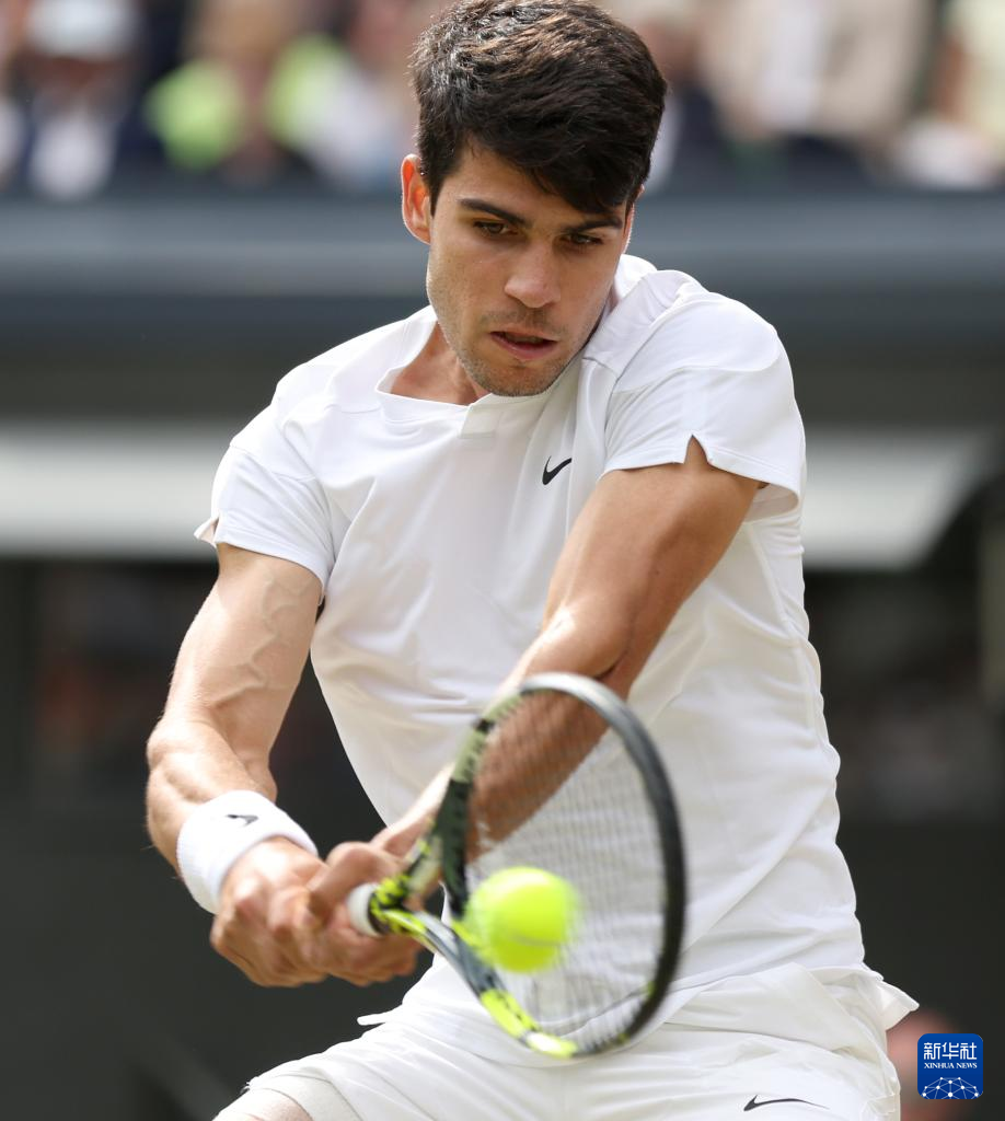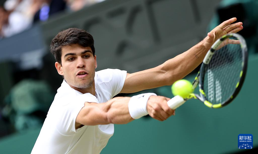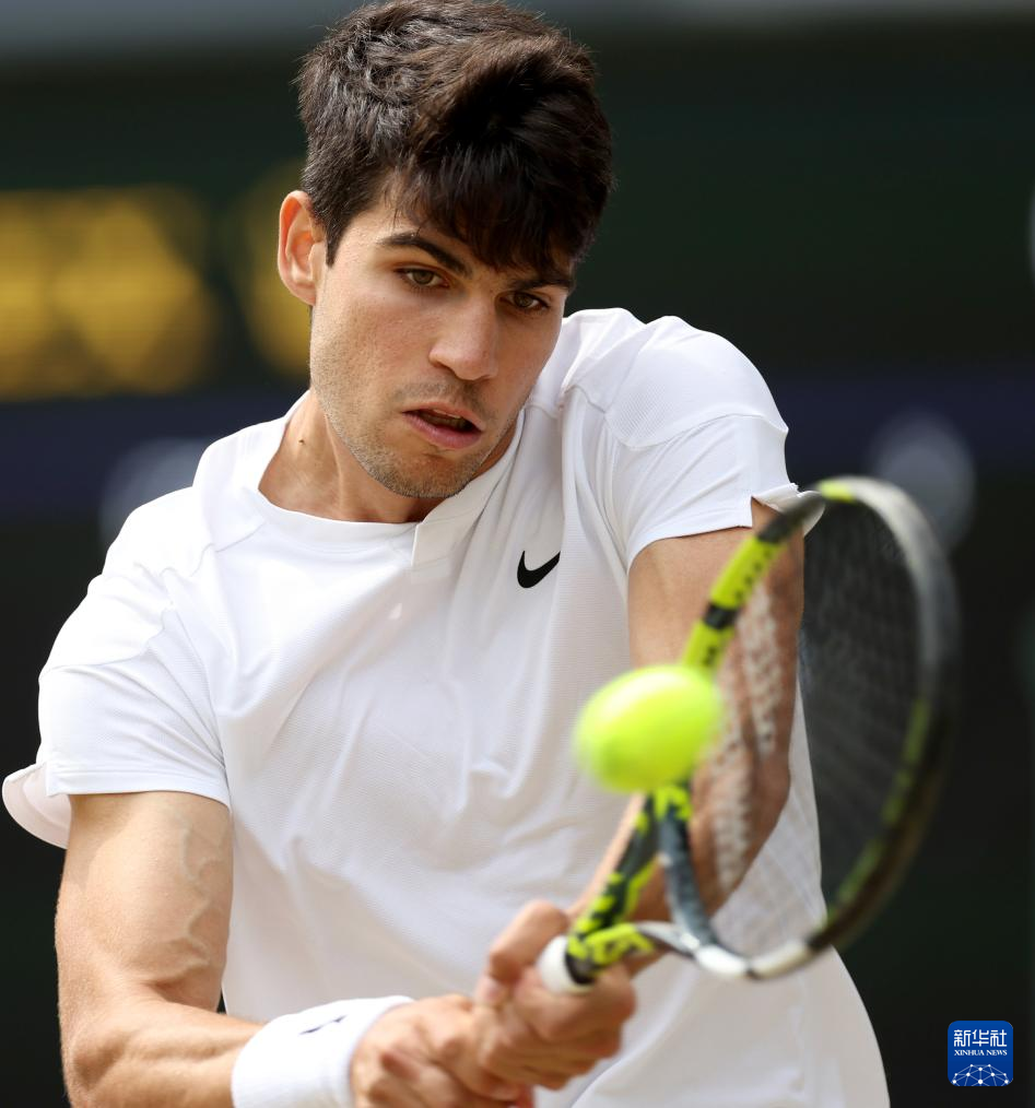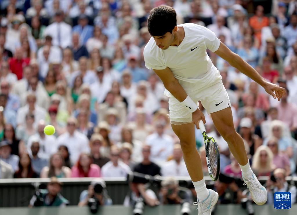 7月14日,阿尔卡拉斯在比赛中回球。新华社记者 李颖 摄