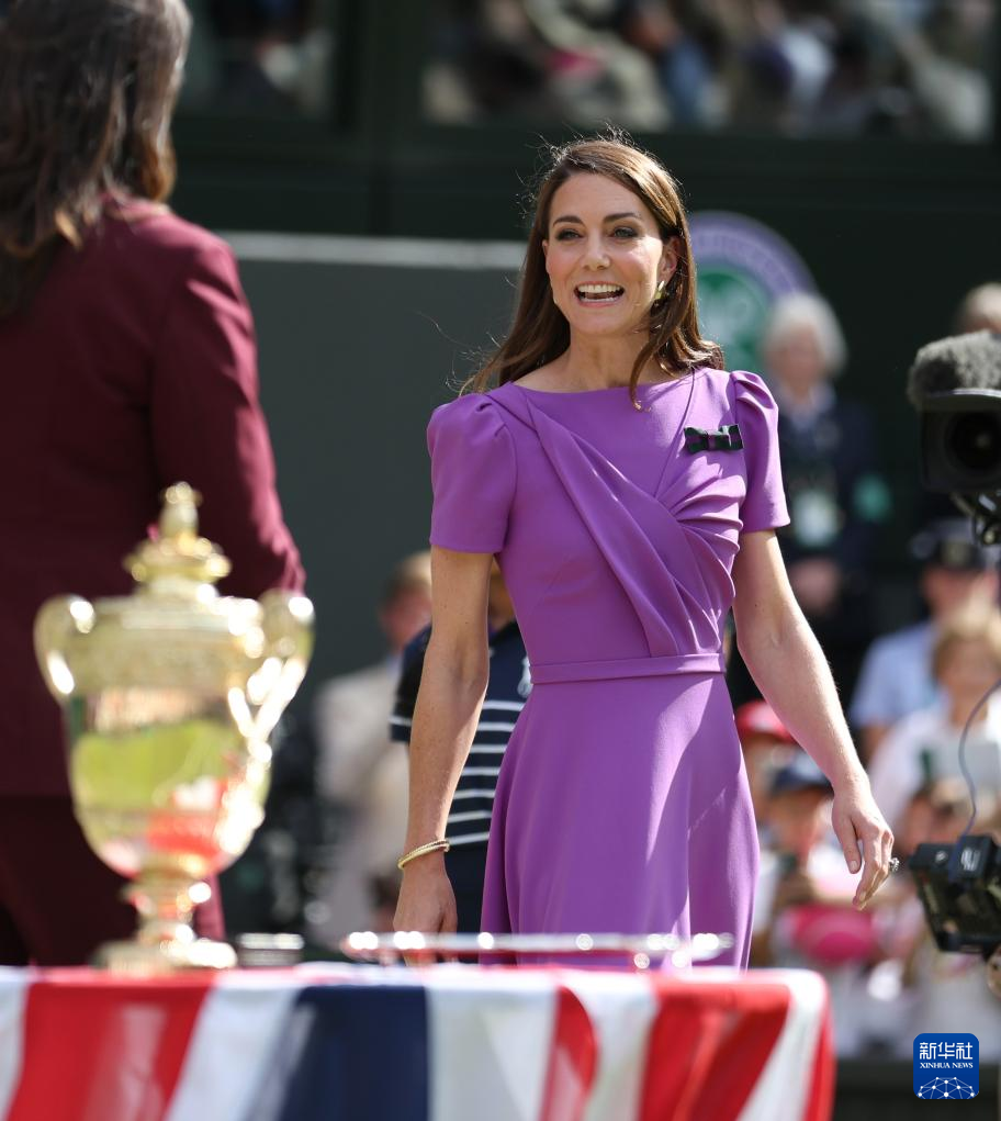 7月14日,英国凯特王妃准备为阿尔卡拉斯和焦科维奇颁奖。新华社记者 李颖 摄
