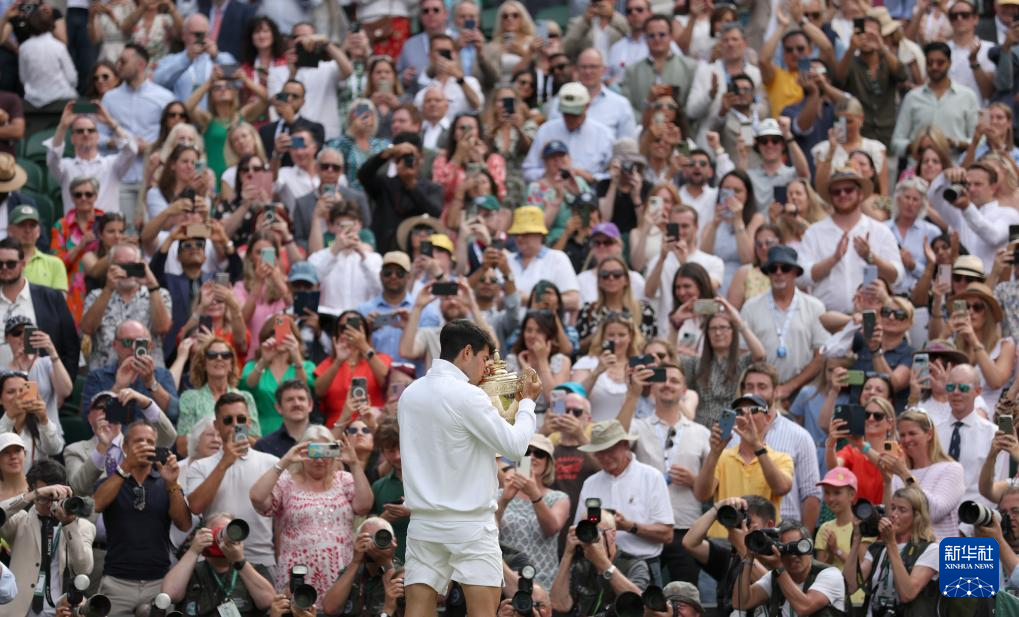 7月14日,阿尔卡拉斯在比赛后向观众展示奖杯。新华社记者 李颖 摄