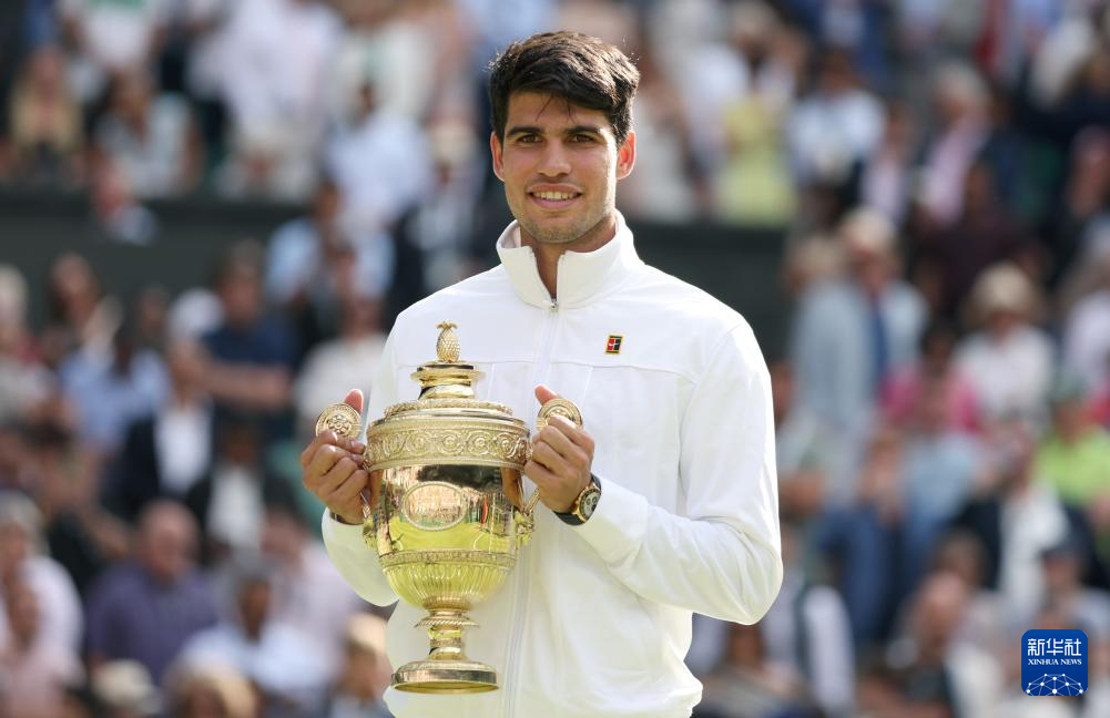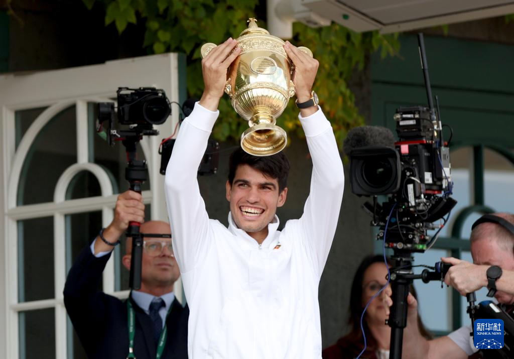 7月14日,阿尔卡拉斯在颁奖仪式上展示奖杯。新华社记者 李颖 摄